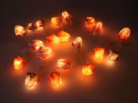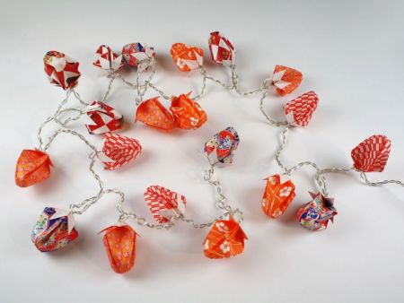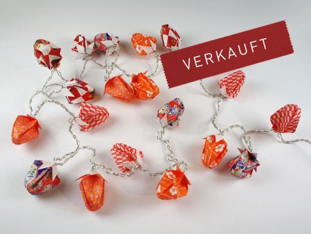 Gleich 20 kleine strahlende Sonnen in Rot und Orange schmücken diese Origami-Lichterkette. Die kleinen Lampionblumen sind in liebevoller Handarbeit gefaltet aus Japanpapier. Bedruckt ist dieses mit traditionell japanischen Mustern in Kyoto bei der renommierten Druckerei Hyogensha mit ihren stilvollen Papiererzeugnissen, die das Herz jedes Papierliebhabers höher schlagen lassen.