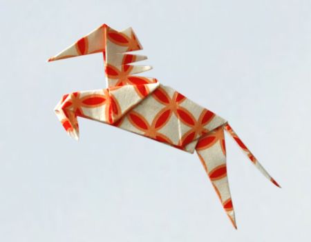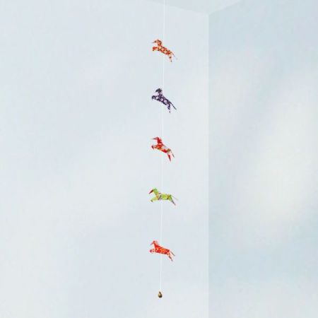 Ein ganz besonderes Mobile für kleine und grosse Pferdefreunde. Diese fünf handgefertigten Origami-Springpferde tanzen munter an einem dünnen Perlonfaden mit einem winzigen, tibetischen Messingglöcken am Ende, das mit jeder Bewegung die Pferde zum Traben anfeuert.
