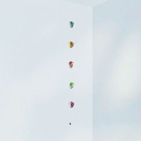 Ein sehr zierliches, verspieltes Mobile mit fünf kleinen Lampions aus japanischem Buntpapier mit Blütenaufdruck, das mit viel Liebe zum Detail von Hand gefaltet wurde. Das Messing-Glöckchen an seinem Ende ist mit seinen gerade mal 8 mm Breite winzig klein.